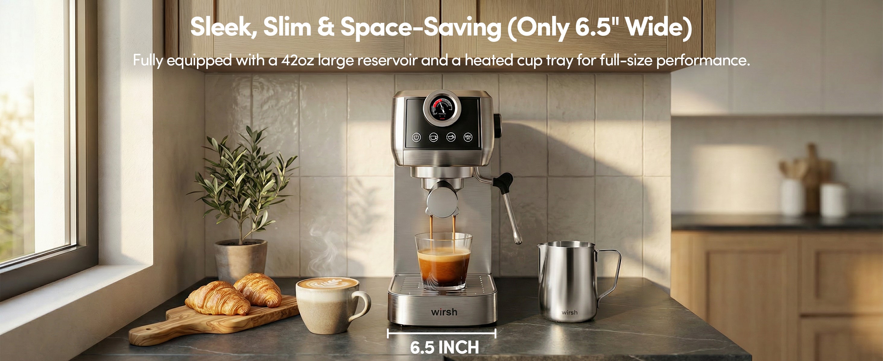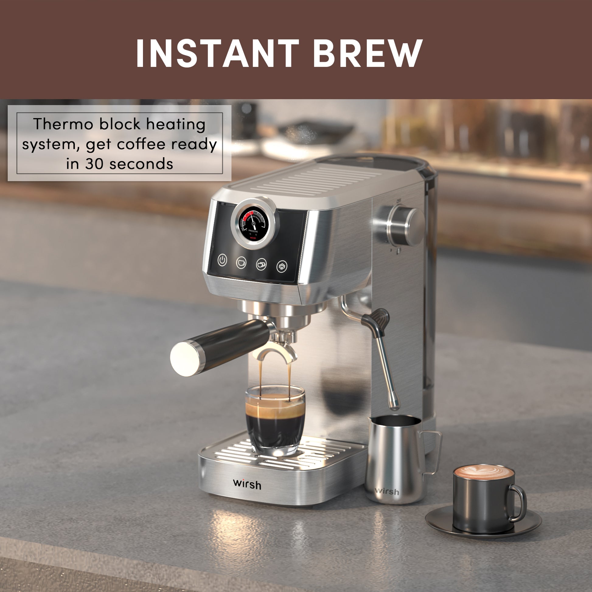 Wirsh 20 Bar Espresso Machine with Plastic Free Portafitler and Steamer, Pressure Gauge, Touch Screen, Full Stainless Steel (Home Barista Plus)